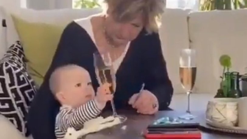 Συγκεκριμένα, ένα βίντεο που κάνει τον γύρο του διαδικτύου, μια γιαγιά κρατάει το εγγόνι της, το οποίο παραλίγο να ρίξει στο πάτωμα ένα ποτήρι με σαμπάνια.