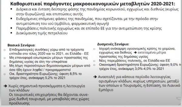 Δυνατότητες σημαντικής ανάκαμψης το 2021, εάν δεν συμβεί μια έντονη κλιμάκωση της υγειονομικής κρίσης στη διάρκειά του (βασικό σενάριο προβλέψεων). Θα προέλθει κυρίως από τη λειτουργία της μεγάλης πλειονότητας των κλάδων χωρίς προσκόμματα, τη σημαντική κλιμάκωση των επενδύσεων, χάρη και στους πρόσθετους πόρους από το Ευρωπαϊκό Ταμείο Ανάκαμψης και την ΕΚΤ, καθώς και από την αναθέρμανση του διεθνούς εμπορίου, που θα ευνοήσει κυρίως τις εξαγωγές υπηρεσιών.