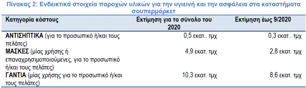 Πρόκειται για ιδιαίτερα υψηλά κόστη, καθώς το δίκτυο των καταστημάτων σουπερμάρκετ στην Ελλάδα είναι ιδιαίτερα εκτεταμένο με πάνω από 4.700 καταστήματα με πάνω από 90.000 εργαζόμενους. το μέγεθος των οποίων γίνεται περισσότερο αντιληπτό όταν αναφερθούν αριθμητικά στοιχεία. Μέχρι τον Σεπτέμβριο του 2020 έχουν χρησιμοποιηθεί πάνω από 2,83 εκατ. μάσκες, 8,62 εκατ. γάντια και 302 χιλ. συσκευασίες αντισηπτικών, βλ. πίνακα 2.