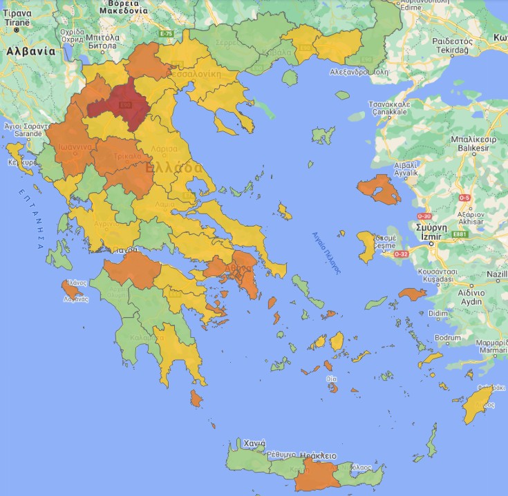 Στο «πορτοκαλί» επίπεδο βρίσκονται αυτή τη στιγμή Αττική, Θεσσαλονίκη, Ηράκλειο, Λέσβος, Σάμος, Αχαΐα, Ζάκυνθος, Ιωάννινα, Καρδίτσα, Τρίκαλα, Πέλλα, Σέρρες, Λάρισα, Βοιωτία και συγκεκριμένα νησιά των Κυκλάδων, ενώ αρμοδίως τονίζεται ότι ο χάρτης αυτός αναθεωρείται σε καθημερινή πλέον βάση.