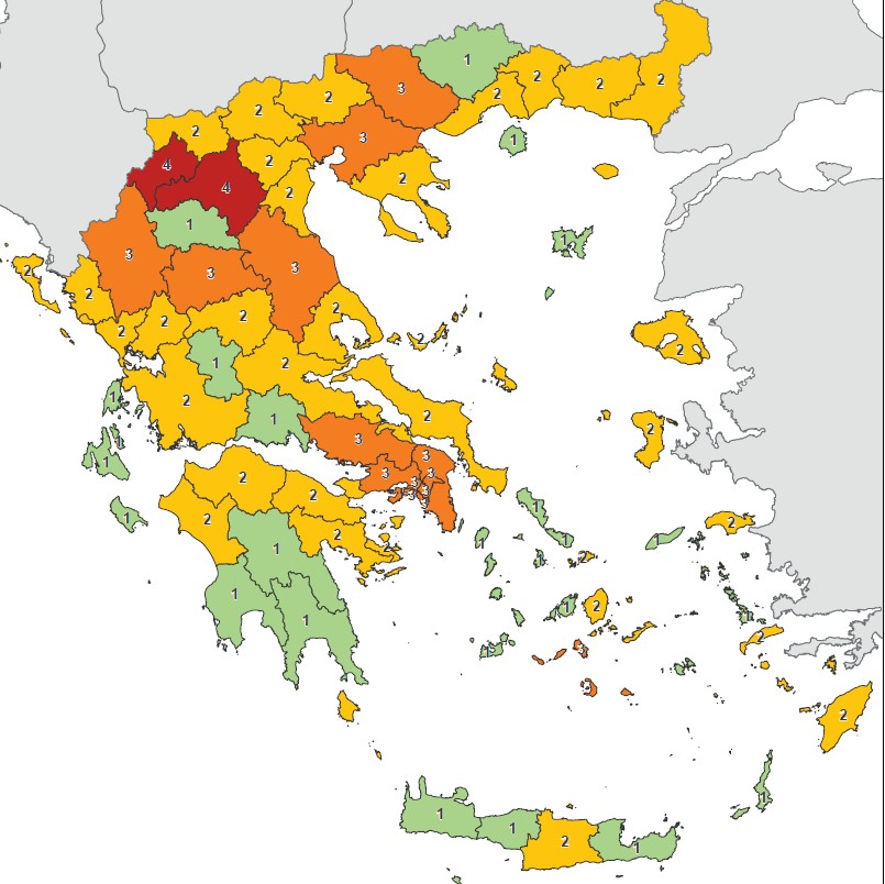 Επίσης, η Άρτα, ο Έβρος, η Θεσπρωτία, η Ηλεία, Καβάλα και η Σκιάθος περνούν από το επίπεδο 1 στο επίπεδο 2, γίνονται δηλαδή «κίτρινες» από πράσινες.