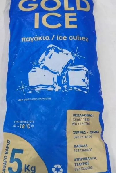 Παγάκια συσκευασμένα GOLD ICE, σε κλειστή πλαστική συσκευασία 5 κιλών, με ημερομηνία παραγωγής 24-09-2020 και ημερομηνία λήξης 24-10-2021, το οποίο παράγεται από την επιχείρηση ΤΣΕΡΤΣΕΝΕΣ ΓΕΩ. ΕΥΑΓΓΕΛΟΣ, ΑΣΣΗΡΟΣ (ΔΗΜΟΥ ΛΑΓΚΑΔΑ) ΘΕΣΣΑΛΟΝΙΚΗΣ και διανέμεται από την επιχείρηση ΠΑΠΑΖΟΓΛΟΥ ΔΗΜ. ΖΗΝΟΒΙΑ, Περιοχή Παραλίμνιο Σερρών.