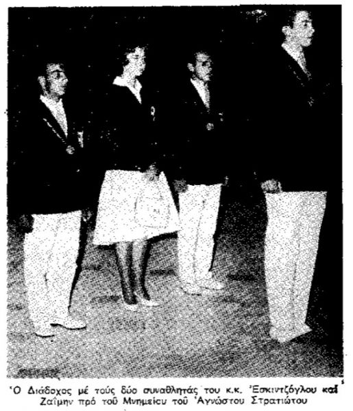 «Δεκάδες χιλιάδες λαού των Αθηνών και του Πειραιώς επεφύλαξαν χθες θερμήν και εγκάρδιον υποδοχήν εις τον Διάδοχο – Ολυμπιονίκην και τους συναθλητάς του κ.κ. Ζαΐμην και Εσκιτζόγλου οι οποίοι επέστρεψαν εκ Ρώμης εις Αθήνας».