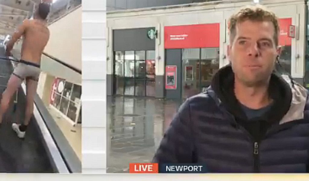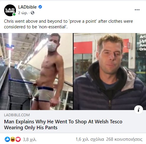 Σύμφωνα με το ladbible.com, ο Κρίστοφερ Νόντεν, από το Νιούπορτ, μπήκε έτσι στο κατάστημα, κατά τη διάρκεια της 17ήμερης καραντίνας κατά την οποία τα σούπερ μάρκετ απαγορεύτηκε να πωλούν «μη απαραίτητα» αντικείμενα, όπως ρούχα, παπούτσια, παιχνίδια και κλινοσκεπάσματα.