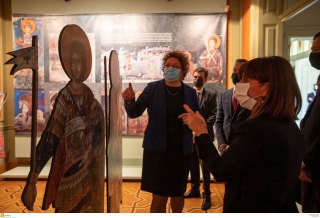 Η Πρόεδρος της Δημοκρατίας σημείωσε πως η ξενάγησή της στη Δημοτική Πινακοθήκη και στην έκθεση με θέμα «Στρατιωτικοί Άγιοι του Βυζαντίου» της έφερε στο νου μια υποβλητική εικόνα του φημισμένου ζωγράφου Μιχαήλ Δαμασκηνού, που βρίσκεται στο Μουσείο Μπενάκη για την οποία είπε τα εξής:
