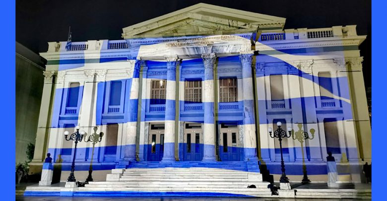 Ο δήμος Πειραιά «έντυσε» το Δημοτικό Θέατρο Πειραιά στα γαλανόλευκα, με μια τεράστια ελληνική σημαία να κυματίζει στην πρόσοψη του επιβλητικού κτηρίου της πόλης, με την μέθοδο του 3d projection mapping.