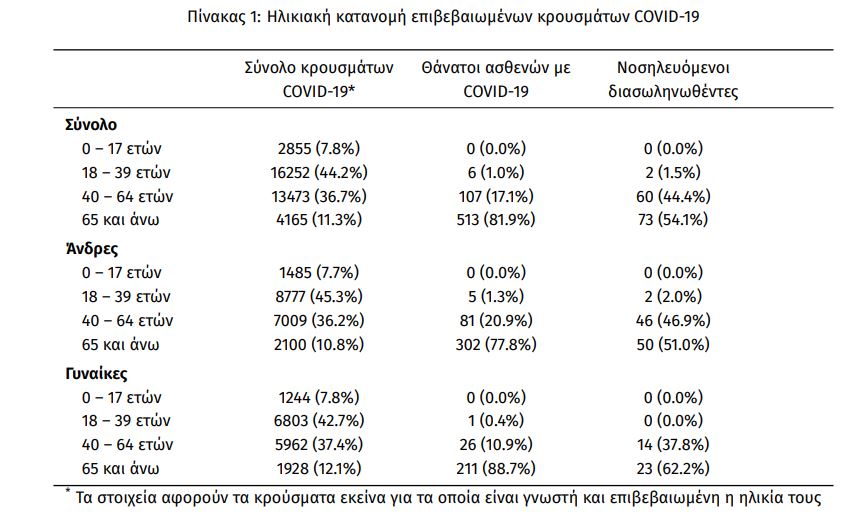 Η ηλικιακή κατανομή των (α) συνολικών κρουσμάτων, (β) των περιστατικών που κατέληξαν σε θάνατο και (γ) των ασθενών που νοσηλεύονται διασωληνωμένοι, είναι η ακόλουθη: