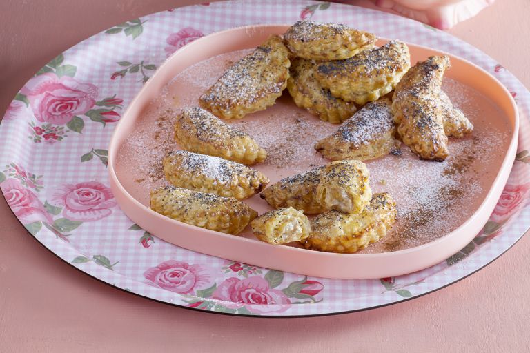 Τοποθετούμε τα πιτάκια με απόσταση μεταξύ τους στο ταψί. Αλείφουμε με αβγό. Πασπαλίζουμε με παπαρουνόσπορο. Ψήνουμε για 20΄. Βγάζουμε από τον φούρνο, κι όταν κρυώσουν ελαφρά πασπαλίζουμε με άχνη και κανέλα.