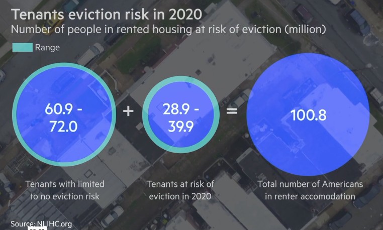 Το μέγεθος της οικονομικής καταστροφής αποτυπώνεται καλύτερα στην αγορά ακινήτων. Περίπου 30 με 40 εκατομμύρια Αμερικανοί ενοικιαστές κινδυνεύουν με έξωση, καθώς η πανδημία έχει δημιουργήσει στρατιές ανέργων.