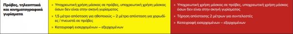 - Για τους συναυλιακούς χώρους, τις θεατρικές παραστάσεις και τις λοιπές παραστατικές τέχνες, στο επίπεδο Α’ (κίτρινο) προβλέπονται τα εξής: