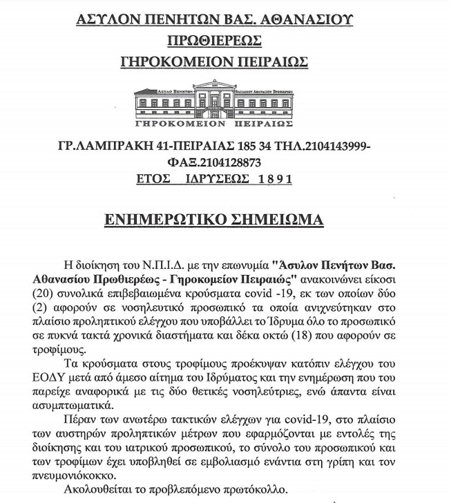 Λίγη ώρα αργότερα, το γηροκομείο εξέδωσε ανακοίνωση, με την οποία γνωστοποιεί πως τα κρούσματα εντοπίστηκαν στα πλαίσια προληπτικού ελέγχου, που υποβάλλει το Ίδρυμα όλο το προσωπικό του, ανά τακτά χρονικά διαστήματα.