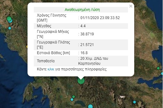 Σύμφωνα το Γεωδυναμικό Ινστιτούτο του Εθνικού Αστεροσκοπείου Αθηνών, ο σεισμός καταγράφηκε την 01.09 σήμερα Δευτέρα και το επίκεντρό του εντοπίστηκε σε απόσταση 20 χιλιομέτρων δυτικά-νοτιοδυτικά του Καρπενησίου.