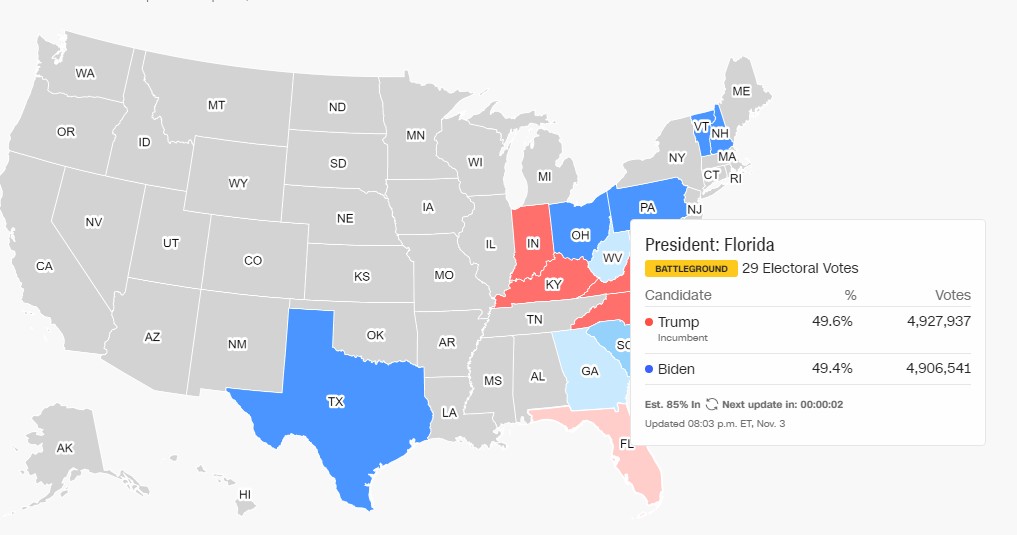 Σύμφωνα με τα πρώτα αποτελέσματα του CNN, με το 82% των ψήφων καταμετρημένο ο Τζο Μπάιντεν και Ντόναλντ Τραμπ, παλεύουν… ψήφο ψήφο!
