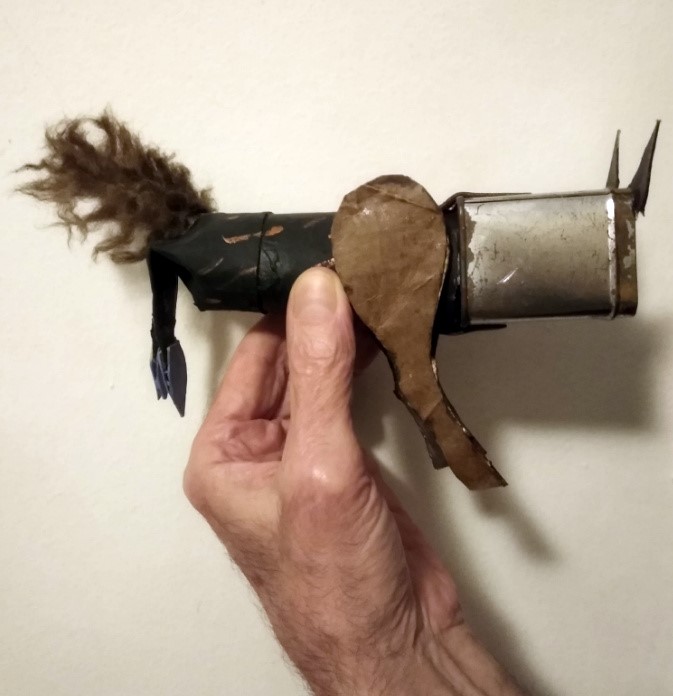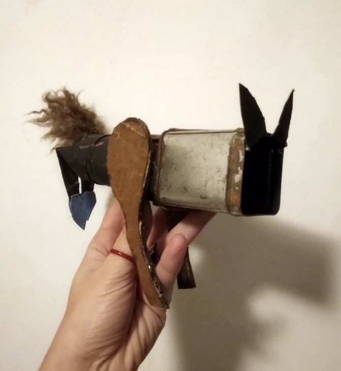 Όπως βλέπετε στις φωτογραφίες, ο Φεγγαροχάφτης μου αποτελείται από ένα ρολό χαρτιού τουαλέτας που το έχω βάψει, ένα σκουριασμένο μεταλλικό κουτάκι, 4 πόδια και δυο τριγωνικά αυτιά φτιαγμένα από σκληρότερο χαρτόνι (κάλλιστα από κάποια συσκευασία που δε την χρειάζεστε).