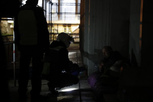 «Μπορείτε να μού φέρετε ένα ζευγάρι παπούτσια; Νούμερο 43-44», λέει ένας άστεγος άνδρας στον δημοτικό αστυνομικό που έχει σκύψει στο προσκεφάλι του και τον ρωτάει εάν είναι καλά. «Κι ένα μπουφάν για τον χειμώνα», προσθέτει βιαστικά.