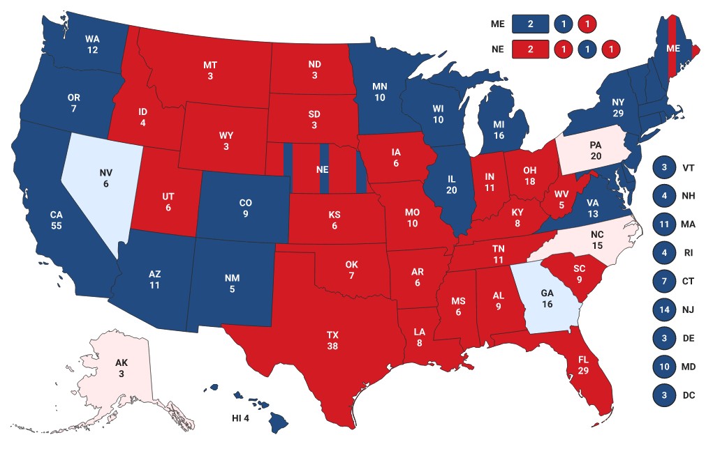 Αντίθετα, για να εξασφαλίσει την επανεκλογή του, ο Τραμπ πρέπει να κερδίσει και στην Πενσυλβάνια και σε μία από τις τρεις: Αριζόνα, Βόρεια Καρολίνα, Νεβάδα και Τζόρτζια.