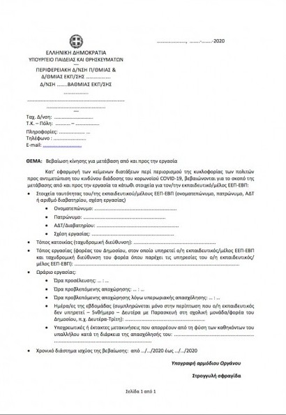 Οι εκπαιδευτικοί,τα μέλη ΕΕΠ-ΕΒΠ και τα στελέχη εκπαίδευσης κατά την προσέλευση και αποχώρησή τους από την υπηρεσία τους, θα πρέπει να φέρουν μαζί τους βεβαίωση κίνησης.