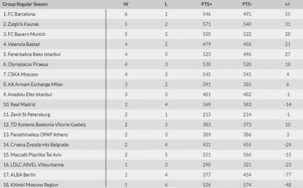 Τα αποτελέσματα και η βαθμολογία της Euroleague