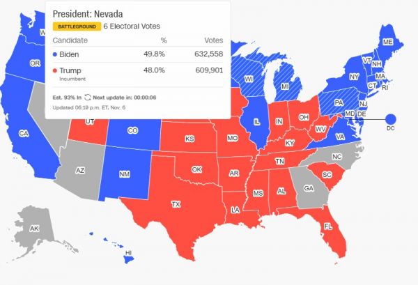 Στη Νεβάδα, ο Μπάιντεν συγκεντρώνει το 49,8%, έναντι του 48.8% που έχει ο Τραμπ, με την καταμέτρηση να βρίσκεται στο 93%.