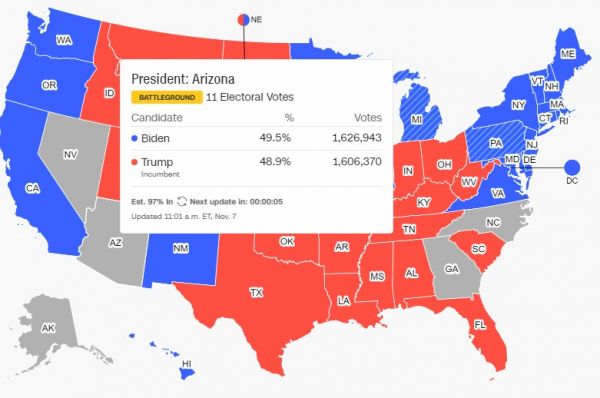 Από την άλλη πλευρά, στην Αριζόνα με την ενσωμάτωση στο 97%, το Μπάιντεν προηγείται με 49.5, έναντι του 48,9 του Τραμπ.