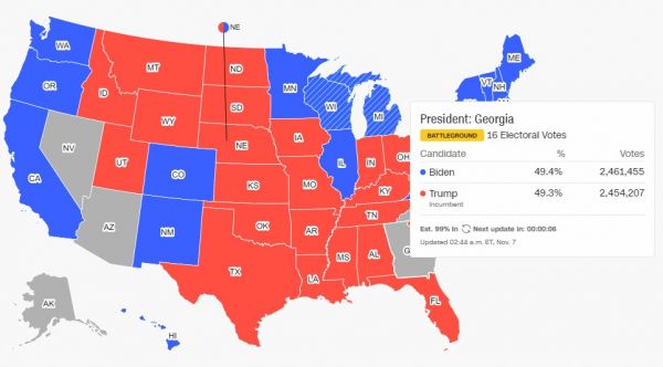Ο νέος πρόεδρος των ΗΠΑ προηγείται και στην Τζόρτζια, αφού με το 99% της ενσωμάτωσης έχει το 49,4%, ενώ ο απερχόμενος -πλέον- πρόεδρος έχει το 49,3%.