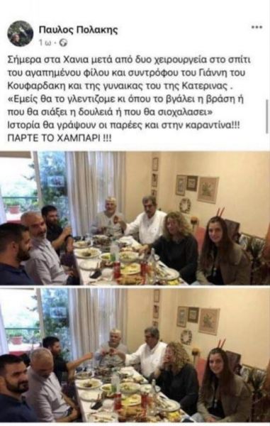 Την έντονη αντίδραση της Νέα Δημοκρατίας προκάλεσε η ανάρτηση φωτογραφιών από τον Παύλο Πολάκη που τον δείχνουν να συντρώγει με μεγάλη παρέα, αγνοώντας - όπως και ο ίδιος το εpισημαίνει υπερηφάνως - τους κανόνες απομόνωσης λόγω του l