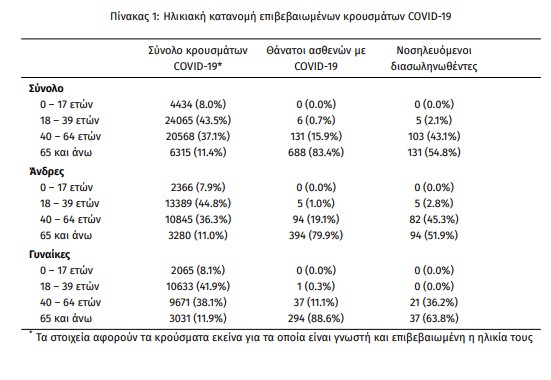 Η μέση ηλικία των κρουσμάτων είναι 39 έτη (εύρος 0 έως 103 ετών), ενώ η μέση ηλικία των θανάτων είναι 79 έτη (εύρος 25 έως 103 ετών). Η ηλικιακή κατανομή των (α) συνολικών κρουσμάτων, (β) των περιστατικών που κατέληξαν σε θάνατο και (γ) των ασθενών που νοσηλεύονται διασωληνωμένοι, είναι η ακόλουθη: