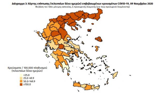 Ο χάρτης αποτυπώνει τη γεωγραφική κατανομή των συνολικών κρουσμάτων COVID-19 (από την αρχή της επιδημίας) ανά Περιφερειακή Ενότητα της χώρας, με βάση την δηλωθείσα διεύθυνση μόνιμης κατοικίας του ασθενούς, ή τη διεύθυνση προσωρινής διαμονής για τους τουρίστες και άλλους προσωρινά διαμένοντες στην Ελλάδα. Συμπεριλαμβάνονται τόσο κρούσματα με ιστορικό ταξιδίου (“εισαγόμενα”) όσο και κρούσματα με πιθανή εγχώρια μετάδοση.
