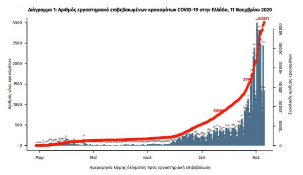 Έτσι, ο συνολικός αριθμός των κρουσμάτων είναι 63. 321, εκ των οποίων το 54.2% άνδρες, ενώ 4.556 (7.2%) θεωρούνται σχετιζόμενα με ταξίδι από το εξωτερικό και 17.036 (26.9%) είναι σχετιζόμενα με ήδη γνωστό κρούσμα.