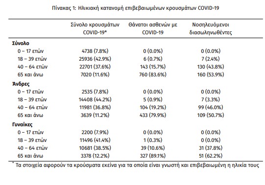 Η μέση ηλικία των κρουσμάτων είναι 39 έτη (εύρος 0 έως 104 ετών), ενώ η μέση ηλικία των θανάτων είναι 79 έτη (εύρος 25 έως 103 ετών). Η ηλικιακή κατανομή των (α) συνολικών κρουσμάτων, (β) των περιστατικών που κατέληξαν σε θάνατο και (γ) των ασθενών που νοσηλεύονται διασωληνωμένοι, είναι η ακόλουθη:
