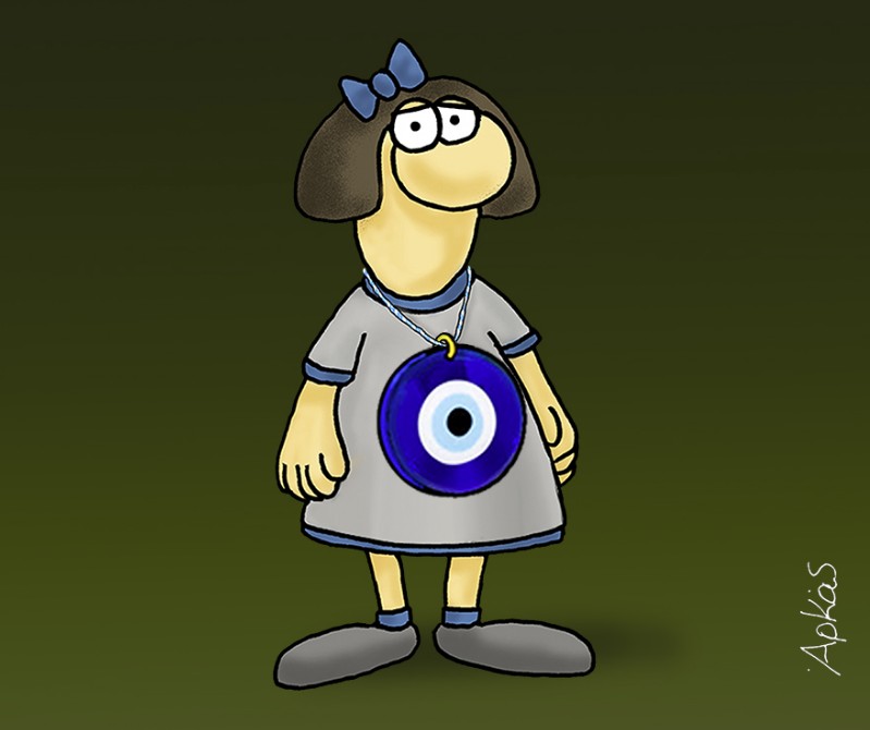 Στην εικόνα απεικονίζεται η ημέρα Παρασκευή, φορώντας στο λαιμό της ένα τεράστιο «ματάκι».