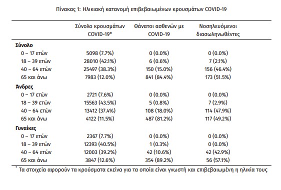 Η μέση ηλικία των κρουσμάτων είναι 40 έτη (εύρος 0 έως 104 ετών), ενώ η μέση ηλικία των θανάτων είναι 80 έτη (εύρος 25 έως 103 ετών). Η ηλικιακή κατανομή των (α) συνολικών κρουσμάτων, (β) των περιστατικών που κατέληξαν σε θάνατο και (γ) των ασθενών που νοσηλεύονται διασωληνωμένοι, είναι η ακόλουθη: