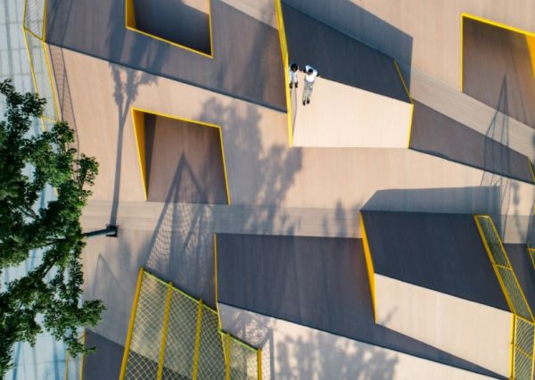 Το αρχιτεκτονικό στούντιο με με έδρα το Λος Άντζελες, ελαχιστοποίησε σκόπιμα τη χρήση εξοπλισμού παιδικής χαράς για να επιτρέψει στα παιδιά να παίζουν με τα διπλωμένα σχήματα του ίδιου του χώρου.