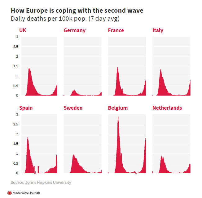 Στην Ιρλανδία, την Ολλανδία και τη Σλοβακία – όπου τα περιοριστικά μέτρα επιβλήθηκαν νωρίτερα κατά το τρέχον δεύτερο κύμα – ο αριθμός των νέων κρουσμάτων μειώθηκε την τελευταία εβδομάδα. Σύμφωνα με την JPMorgan αυτές οι εμπειρίες υποδηλώνουν ότι τα περιοριστικά μέτρα που τέθηκαν σε ισχύ σε όλη την Ευρώπη τις τελευταίες εβδομάδες θα είναι αρκετά για να θέσουν σε έλεγχο την εξάπλωση του ιού για τώρα.