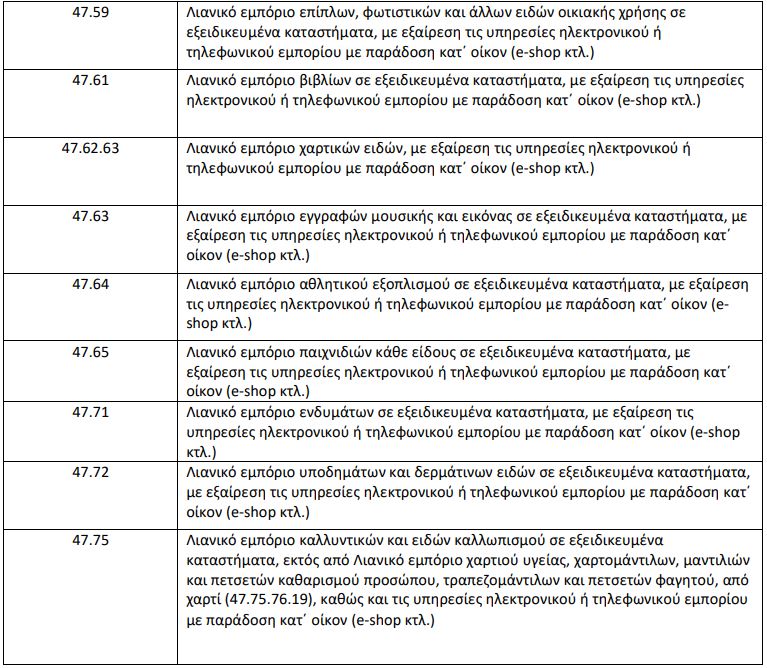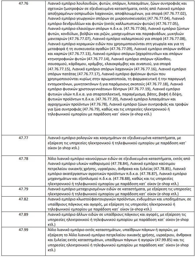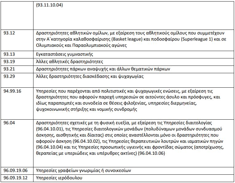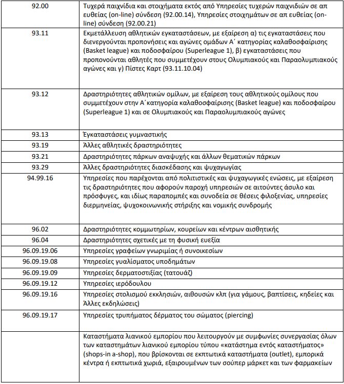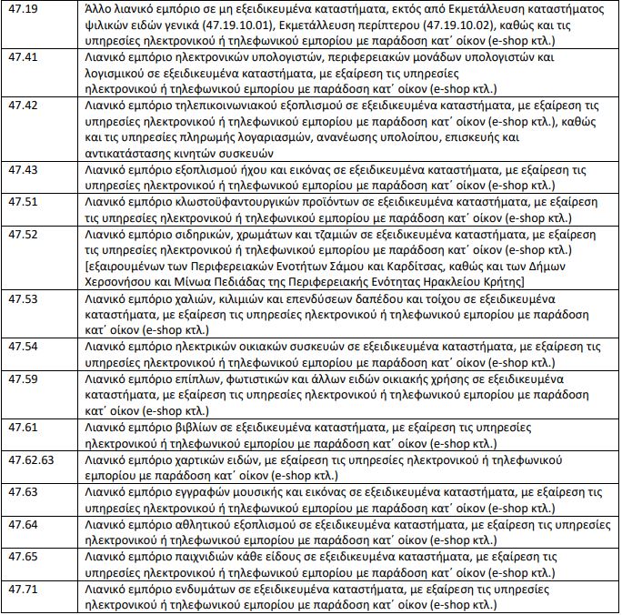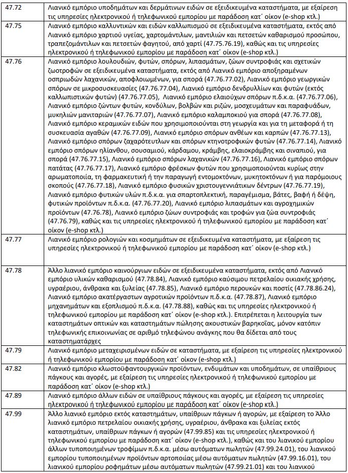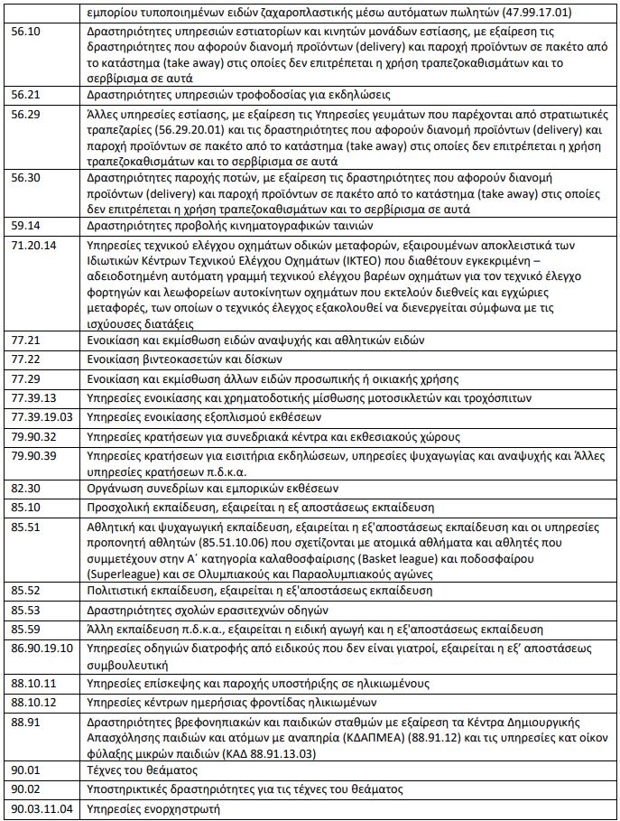 Επιχειρήσεις που έχουν πολλαπλές δραστηριότητες συνεχίζουν τη λειτουργία τους ως προς δραστηριότητες που δεν καταλαμβάνονται από τους ΚΑΔ του παρακάτω Πίνακα. Σε περίπτωση τετραψήφιου ΚΑΔ συμπεριλαμβάνονται όλες οι υποκατηγορίες πενταψήφιων, εξαψήφιων και οκταψήφιων.