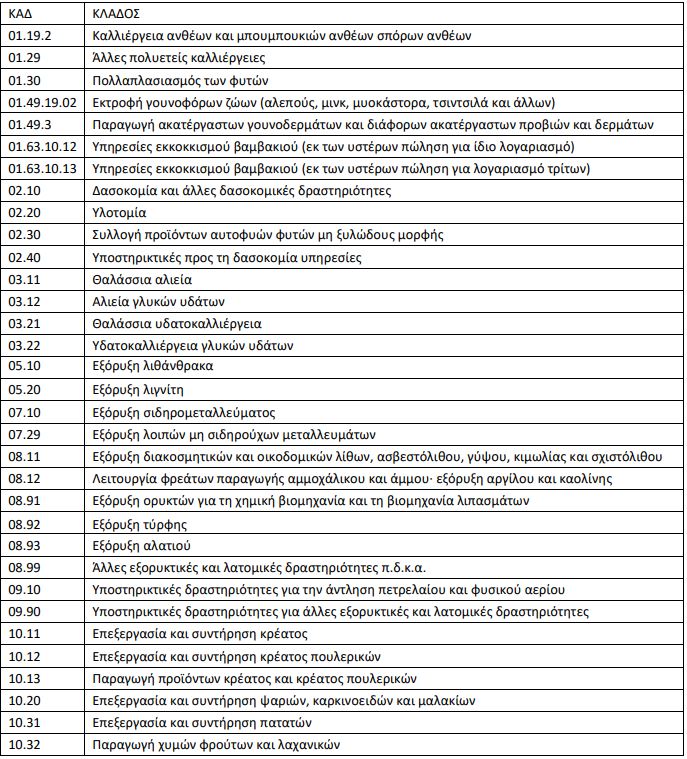 Παρατίθεται πίνακας με τον Κωδικό Αριθμό Δραστηριότητας (ΚΑΔ) των κλάδων που πλήττονται. Σε περίπτωση τετραψήφιου ΚΑΔ συμπεριλαμβάνονται όλες οι υποκατηγορίες πενταψήφιων, εξαψήφιων και οκταψήφιων. Σε περίπτωση πενταξήφιου συμπεριλαμβάνονται όλες οι κατηγορίες εξαψήφιων και οκταψήφιων. Σε περίπτωση εξαψήφιου συμπεριλαμβάνονται όλες οι κατηγορίες οκταψήφιων.