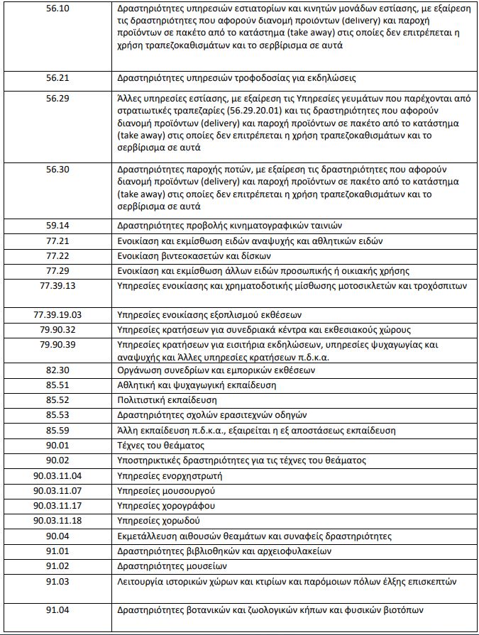 Παρατίθεται πίνακας με τον Κωδικό Αριθμό Δραστηριότητας (ΚΑΔ) των δραστηριοτήτων που αναστέλλονται. Δεν απαγορεύεται η διενέργεια εργασιών χωρίς την παρουσία κοινού στις ιδιωτικές επιχειρήσεις που περιλαμβάνονται στους ΚΑΔ του κατωτέρω Πίνακα. Επιχειρήσεις που έχουν πολλαπλές δραστηριότητες συνεχίζουν τη λειτουργία τους ως προς δραστηριότητες που δεν καταλαμβάνονται από τους ΚΑΔ του παρακάτω Πίνακα.