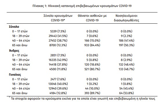 Η μέση ηλικία των κρουσμάτων είναι 40 έτη (εύρος 0 έως 104 ετών), ενώ η μέση ηλικία των θανάτων είναι 80 έτη (εύρος 25 έως 103 ετών). Η ηλικιακή κατανομή των (α) συνολικών κρουσμάτων, (β) των περιστατικών που κατέληξαν σε θάνατο και (γ) των ασθενών που νοσηλεύονται διασωληνωμένοι, είναι η ακόλουθη: