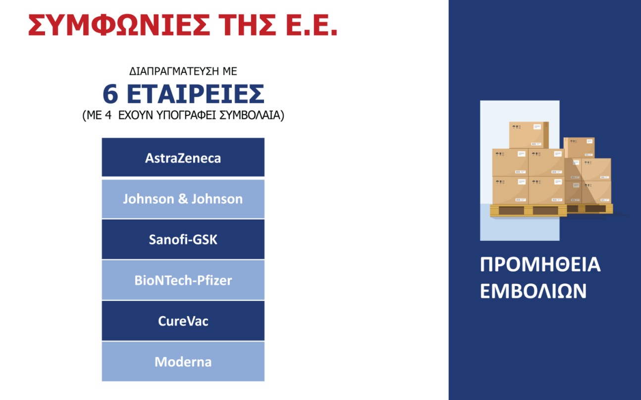 Η ΕΕ έχει υπογράψει συμφωνίες με τις εταιρίες Pfizer, Biontech, Astra Zeneca, Sanofi και Johnson & Johnson, ενώ βρίσκεται σε συνομιλίες και με άλλες εταιρείες. Συμφωνία προαγοράς έχει υπογραφεί με τις δύο πρώτες, καθώς η αποτελεσματικότητα του πειραματικού τους εμβολίου ανέρχεται στο 90%.