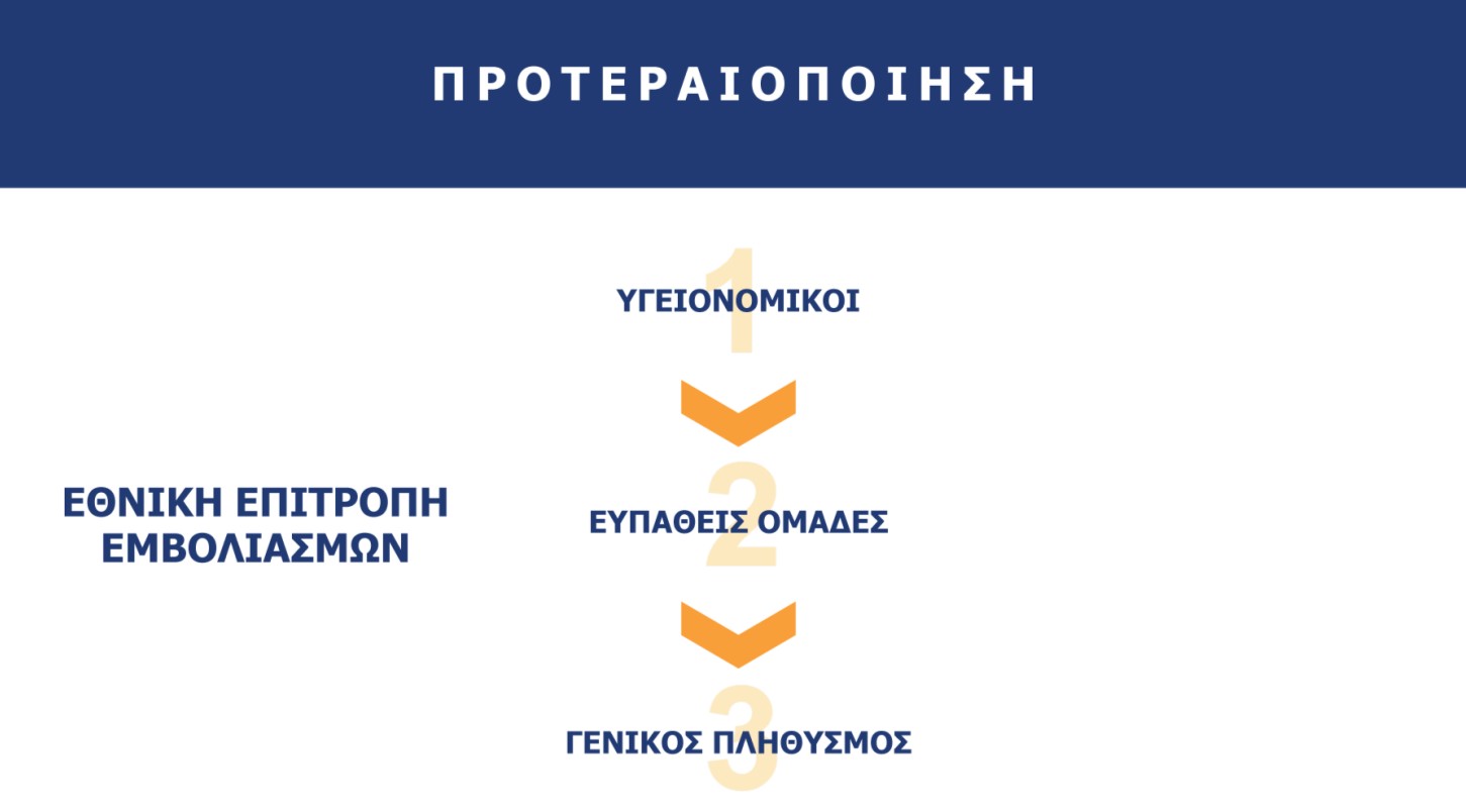 Προτεραιότητα στον εμβολιασμό θα έχουν οι υγειονομικοί και οι ευπαθείς ομάδες, και στη συνέχεια ο γενικός πληθυσμός.