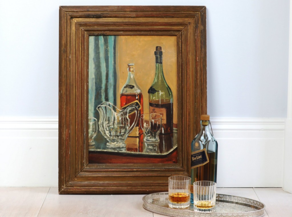The painting is of Johnny Walker’s Black label whiskey, Churchill’s…