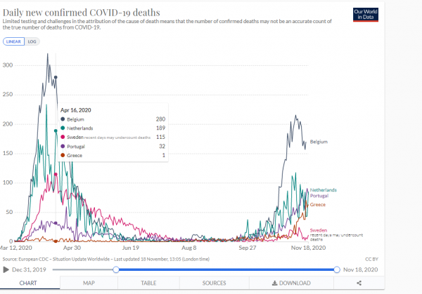 Όπως φαίνεται και στο παρακάτω διάγραμμα, η χώρα μας βρίσκεται στην τέταρτη θέση όσον αφορά τους ημερήσιους θανάτους μεταξύ χωρών με ίδιο πληθυσμό και έκταση, ενώ το Βέλγιο συνεχίζει να είναι μακράν πρώτο στην «μαύρη» λίστα.