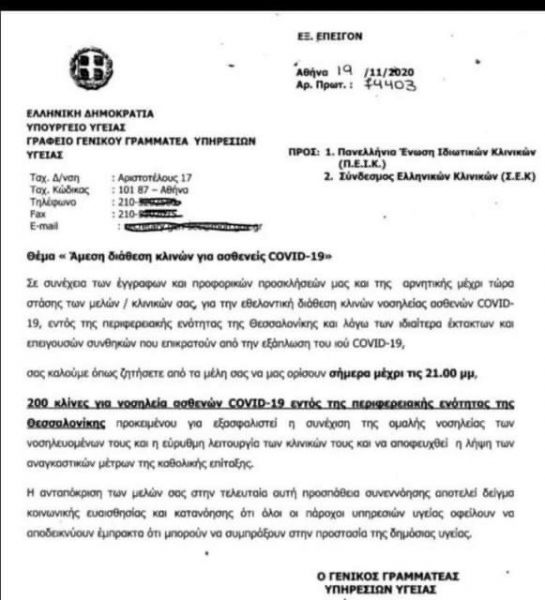 Με την κατάσταση με τον κοροναϊό να έχει ξεφύγει πέρα από κάθε έλεγχο στην συμπρωτεύουσα, το υπουργείο Υγείας έστειλε έγγραφο – τελεσίγραφο στις ιδιωτικές κλινικές της Θεσσαλονίκης ζητώντας να παραχωρήσουν 200 κλίνες για την νοσηλεία επιβεβαιωμένων περιστατικών κοροναϊού.