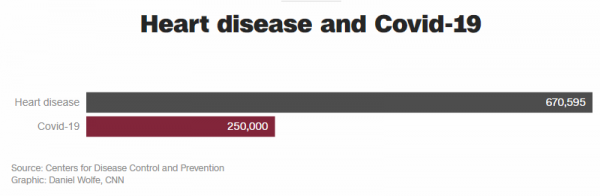 Σύμφωνα με την πρόβλεψη του Ινστιτούτου Υγείας του Πανεπιστημίου της Ουάσινγκτον ο Covid-19 τον Ιανουάριο θα σκοτώνει 2.500 ανθρώπους σε μια ημέρα. Σύμφωνα με τα στοιχεία του 2017, 2.353 άνθρωποι πεθαίνουν κάθε μέρα από καρδιαγγειακές παθήσεις.