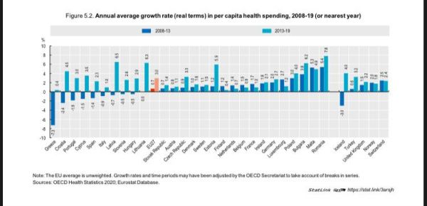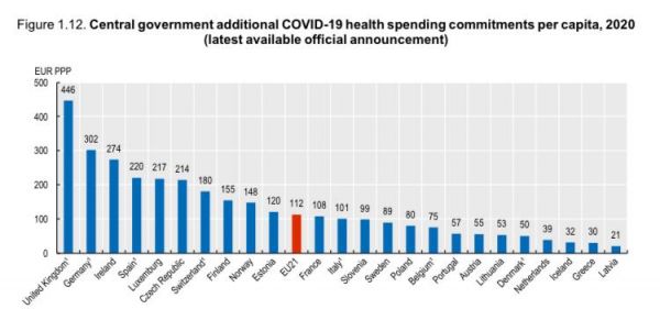 Όπως φαίνεται από το γράφημα 1 η χώρα μας είναι δεύτερη από το τέλος σε επιπρόσθετες δαπάνες υγείας για το έτος 2020 (πηγή: OECD/European Union (2020), Health at a Glance: Europe 2020: State of Health in the EU Cycle, OECD Publishing, Paris, https://doi.org/10.1787/82129230-en.)