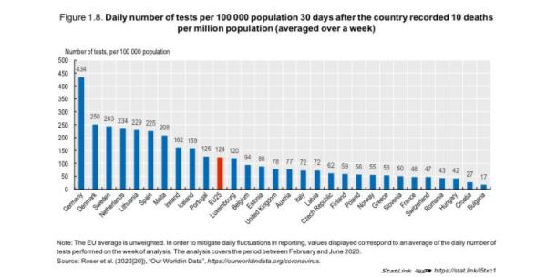 Θα μου πείτε: Ναι, αλλά τουλάχιστον αξιοποιήσαμε καλά τα χρήματα και κάνουμε πολλά τεστ για παράδειγμα όπως προτείνει ο Παγκόσμιος Οργανισμός Υγείας. Όπως φαίνεται στο γράφημα 2 (πηγή: ίδια) στα τεστ είμαστε πάλι στον πάτο. 8οι από το τέλος.