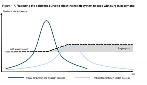 Ναι αλλά τι νόημα έχουν όλα αυτά θα ρωτήσει κάποιος; Η απάντηση είναι το γράφημα 3 (πηγή: ίδια). Τα περιοριστικά μέτρα τα παίρνουμε ώστε να προλάβουμε να βελτιώσουμε τις δυνατότητες του συστήματος υγείας (Γκρι περιοχή). Αν παίρνουμε περιοριστικά μέτρα χωρίς να βελτιώνουμε το σύστημα υγείας κάνουμε μια τρύπα στο νερό. Μια τρύπα με τεράστιο κόστος, σε όρους οικονομικούς, κοινωνικούς, ψυχικής υγείας.