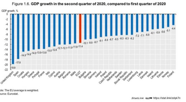 Ναι θα μου πείτε, μπορεί να μην έκαναν όσα πρέπει στο υγειονομικό αλλά τουλάχιστον προστάτευσαν την οικονομία. Κι όμως και εδώ είναι πάλι πρωταθλητές από το τέλος. Γράφημα 4 (πηγή: ίδια). Αυτή τη στιγμή φαίνεται ότι βαδίζουμε για διψήφια ύφεση το 2020 και ασθενική ανάπτυξη το 2021. Απέναντι σε κάθε πρόβλεψη του οικονομικού επιτελείου της κυβέρνησης. Και έχουν κάνει δεκάδες. Άλλωστε είναι πλέον γνωστό ότι αν δεν είχε αφήσει ο ΣΥΡΙΖΑ το μαξιλάρι η χώρα θα είχε χρεοκοπήσει.