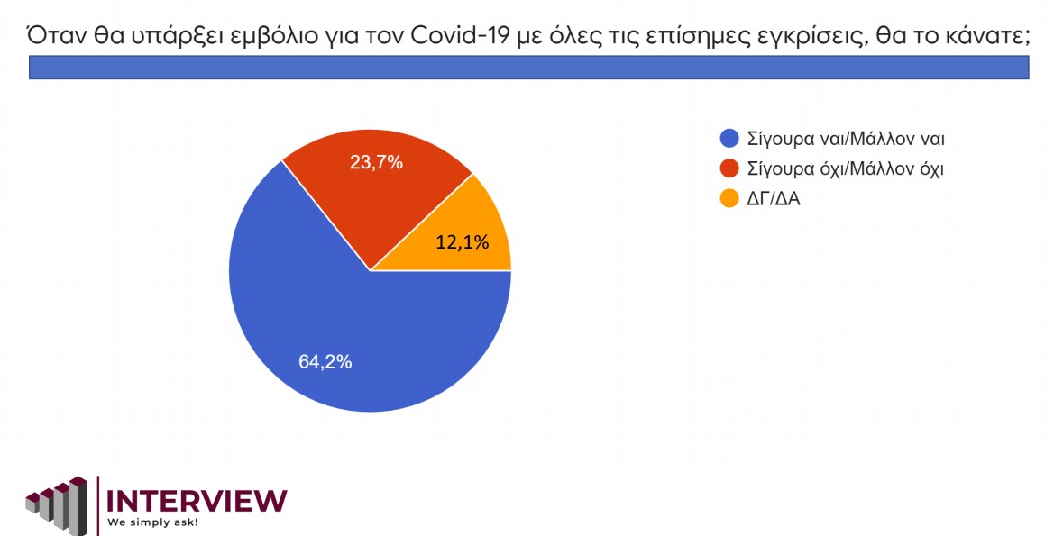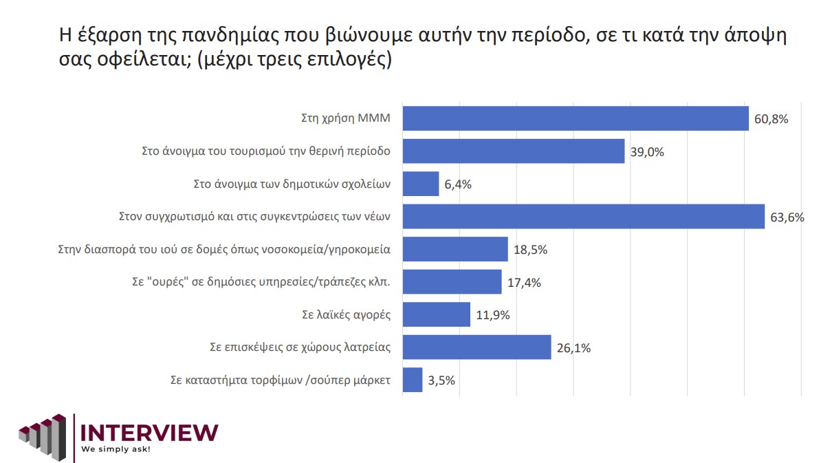 Αυτό προκύπτει από έρευνα της Interview, σύμφωνα με την οποία, το 64,2% θα έκαναν το εμβόλιο, τη στιγμή που το 63,6% «ενοχοποιεί» τον συγχρωτισμό και τις συγκεντρώσεις των νέων για την έξαρση του δεύτερου κύματος, ενώ το 60,8% τις μετακινήσεις στα ΜΜΜ.
