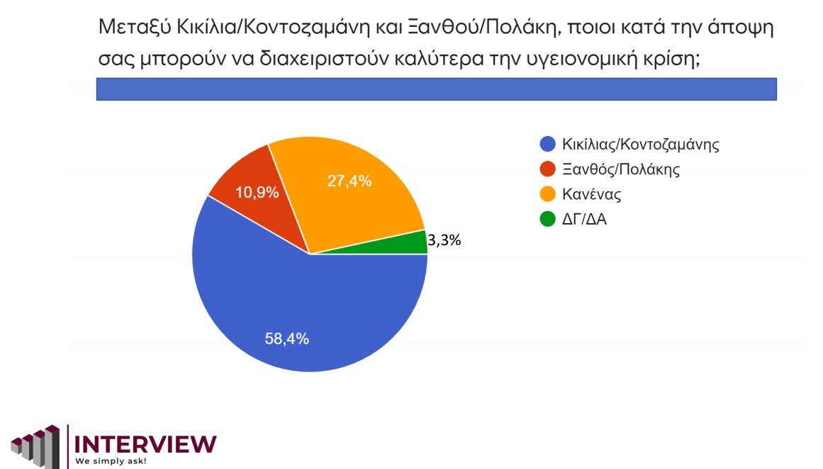 Παράλληλα, μεταξύ του δίδυμου Κικίλια/Κοντοζαμάνη και Ξανθού/Πολάκη, υπερισχύει το πρώτο με 58,4% όσον αφορά στην ικανότητα καλύτερης διαχείρισης της υγειονομικής κρίσης.